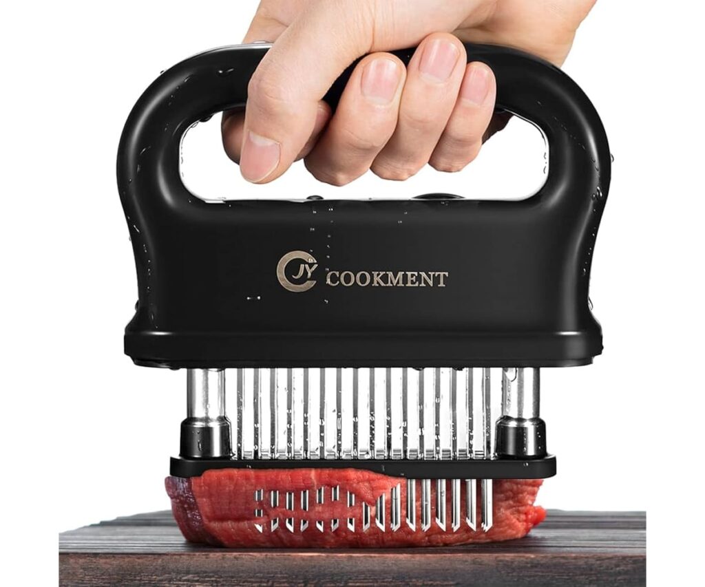 The JY COOKMENT meat tenderizer is equipped with 48 ultra-sharp stainless steel needle blades, which not only tenderize meat quickly but also enhance the flavor absorption from marinades, making your meals more flavorful and juicy.